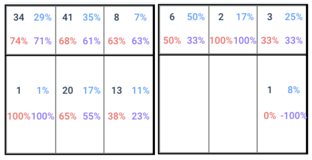 Istotne jest również to, jacy gracze znajdują się na boisku. Ten sam rozgrywający z graczem X może grać zupełnie inaczej, niż z graczem Y. Dlaczego? Jednemu ufa znacznie bardziej, niż drugiemu. Pierwszy może być “pewniejszy” i będzie zdobywał więcej punktów niż drugi. To może determinować dystrybucję rozgrywającego. Poniższa grafika pokazuje, jak Ben Toniutti w tym sezonie rozgrywa piłki po dobrym przyjęciu z Łukaszem Kaczmarkiem i z Bartłomiejem Kluthem. Oczywiście znacznie więcej piłek mamy z tym pierwszym, ponieważ więcej grał. Chodzi mi bardziej o niebieskie liczby, które stanowią procent dystrybucji. Gdy Kaczmarek był na boisku, na lewe skrzydło poleciało 29% piłek. Z Kluthem dystrybucja do przyjmujących wzrosła do 50%. Interesujące jest, że łącznie na prawym skrzydle z Łukaszem Ben wystawił 18% piłek, a z drugim atakującym 33%. Efektywność ataku (fioletowa liczba) jest jednak znacznie na korzyść podstawowego gracza.