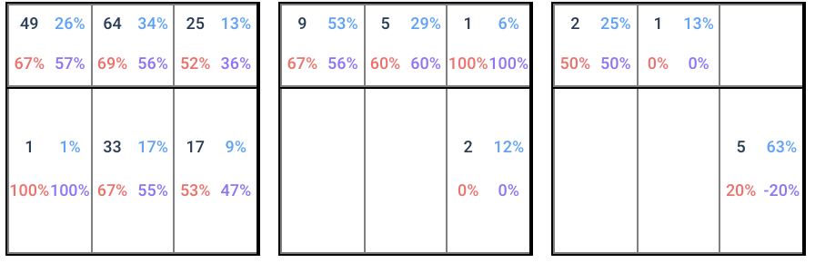 Moglibyśmy to jeszcze rozbić na kilka lub nawet kilkanaście bardziej szczegółowych sposobów, ale na początek to wystarczy. Myślicie, że to jest niewielka różnica? Otóż nie! Poniżej mamy przykład dystrybucji jednego z rozgrywających. A wiedz, że jest to dość typowy rozkład w Pluslidze. Pierwsza sytuacja, czyli najście środkowego na krótką z przodu, jest najczęściej stosowanym rozwiązaniem. Mamy tutaj najwięcej piłek i gra jest dość dobrze zbilansowana pod kątem taktycznym. Druga sytuacja, czyli najście środkowego za plecami rozgrywającego, jest już ciekawsza. Było łącznie siedemnaście takich sytuacji, a aż dziewięć (czyli 53 procent) zostało wystawionych na lewe skrzydło, a pięć (29 procent) do środkowego. To jest interesująca taktycznie informacja. Kolejna sytuacja, czyli najście środkowego na tzw. odkę. Rozegrano wtedy, aż 63 procent (pięć z ośmiu) do atakującego. To tylko przykład, ale takie różnice zdarzają się u każdego rozgrywającego.