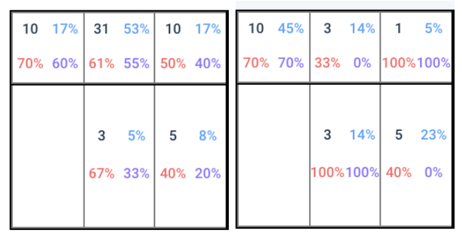 Następna bardzo ważna kwestia do sprawdzenia, to zweryfikowanie jak rozgrywający reaguje na widoczne różnice w bloku, po drugiej stronie siatki. Ma to szczególne znaczenie, gdy któryś z naszych blokujących jest słaby. Najczęściej sytuacja ma miejsce w przypadku bloku rozgrywających i atakujących. Poniżej widzimy właśnie taki podział. Pierwsze boisko, gdy atakujący rywala stał w bloku. Rozgrywający znacznie mniej piłek wystawiał w tamto miejsce, bo tylko 17 procent. Więcej leciało jednak do środkowych (aż 53 procent). Drugie boisko to sytuacja, gdy rozgrywający rywala (słaby blokujący) stał pod siatką. Aż 45 procent piłek wędrowało przeciw niemu. Wszystko kosztem środkowych, którzy teraz mieli tylko 14 procent dystrybucji.