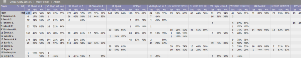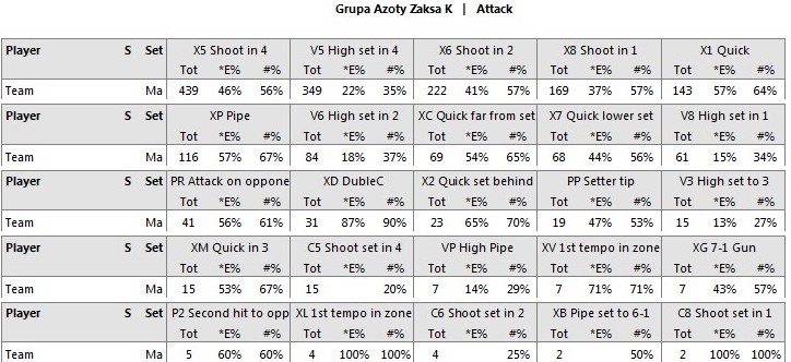 Analiza kombinacji ataków polega na tym, że rozbija wszystkie ataki z podziałem na konkretne typy. Dużo byśmy mogli pisać o rodzajach ataków. Te odnoszące się do ataków środkowych możecie przejrzeć w cyklu, w którym analizowałem typy ataków środkowych. Z reguły “X” odnosi się do ataków piłek szybkich. “V” to piłki wysokie, a “C” tzw. super czyli pomiędzy wysokimi, a szybkimi.