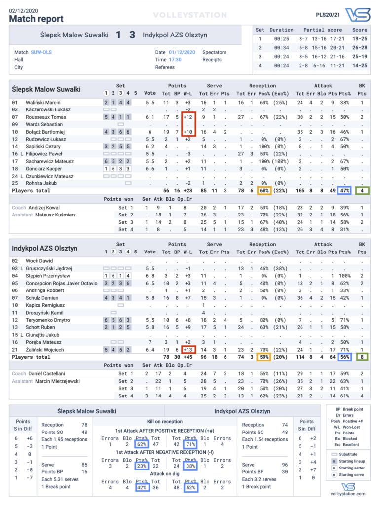 Słowem podsumowania jest coś, co jest typowe dla większości meczów naszej ligi. Zazwyczaj wygrywa drużyna, która lepiej spisuje się w ataku. Co więcej! Taką magiczną granicą, żeby wygrać seta, jest 13 skończonych ataków. Najczęściej zwycięzca właśnie powyżej tej liczby potrzebuje, aby zwyciężyć. Zwróćcie uwagę w raporcie meczowym, że set wygrany przez Suwałki charakteryzował się ich lepszym atakiem niż u rywali.