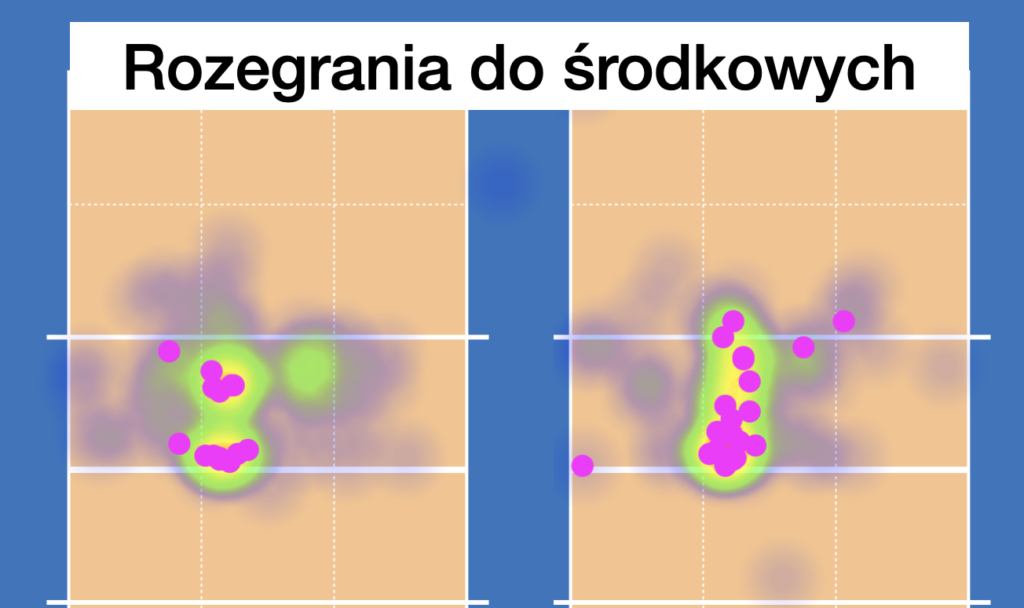 Na koniec chciałbym skupić się na rozgrywających tego meczu, ale już bez pokazywania, które boisko należy do którego rozgrywającego. Poniższe analizy zostały stworzone przy użyciu arkusza autorstwa Iwo Wagnera i jak wszystko w tym wpisie wygenerowane przy pomocy VolleyStation. Fioletowe kropki pokazują miejsca, z których rozgrywający wystawiali piłki do swoich środkowych. Ewidentnie grali z nimi tylko z komfortowych pozycji i mogli przez to być bardzo przewidywalni. W tle, pod kropkami, widać zaciemnienia, które stanowią miejsca pozostałych wystaw. Im większa gęstość, tym więcej było rozegrań z danego miejsca.