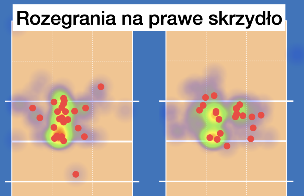 Podobnie sprawa wygląda poniżej. Tym razem zobaczmy, skąd rozgrywający posyłali piłki na prawy atak (czerwone kropki). Tutaj nieco szersze pole, ale dalej wszystko było grane do atakujących z bardzo komfortowych piłek do trzeciego metra od siatki.