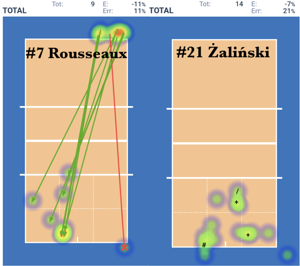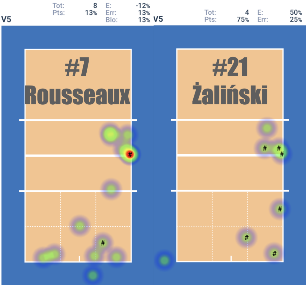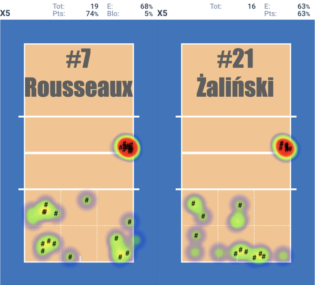 A teraz spójrzmy na ataki z podziałem na ich rodzaje. Na początek szybkie piłki z lewego skrzydła. Statystycy zapisują je jako “X5”. Tomas Rousseaux wykonał 19 ataków, zdobywając 74% punktów i mając 68% efektywności. Wojtek Żaliński: 16 ataków, 63% skuteczności i taka sama efektywność, co oznacza, że nie popełnił błędu. W kierunkach ataku widzimy znak #, który pokazuje, w których miejscach gracze zdobywali punkty (ataki skuteczne).