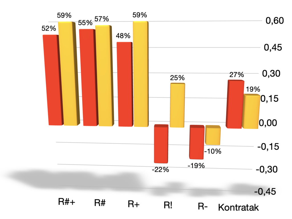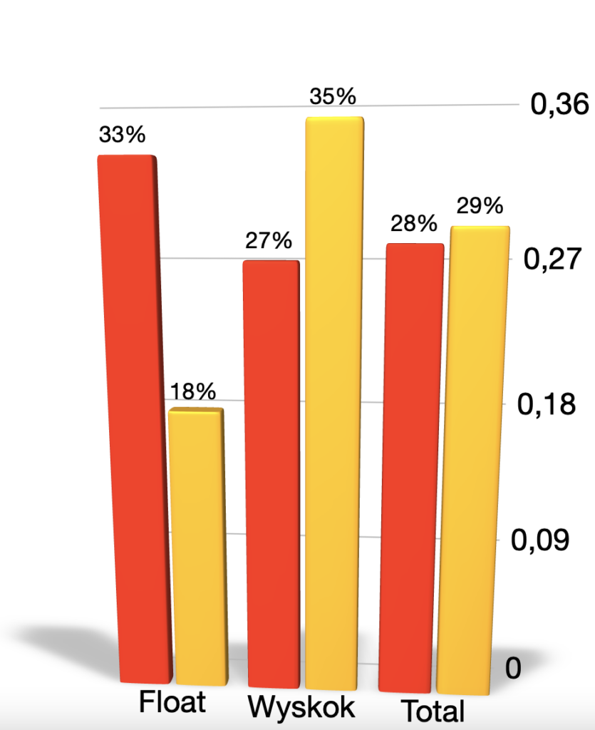 Przejdźmy już do konkretnej analizy. Poniższy wykres pokazuje procent wygranych akcji przy własnej zagrywce. Oczywiście nie jest to w pełni zależne od samego serwisu. Wliczamy tu także kontrataki, bloki punktowe oraz błędy przeciwnika. W tym meczu własna zagrywka dawała 28% szans na punkt Resovii i 29% Trefla. Większe różnice były natomiast przy zagrywce float i wyniosły kolejno 33 i 18 procent. Warto zwrócić uwagę na to, że pierwsi zagrali 24 floaty, a drudzy 33. Zagrywka z wyskoku to przewaga Gdańska. Osiągnęli 35% szans na wygranie akcji, a gospodarze 27%. W tym przypadku, to właśnie gospodarze zagrywali więcej z wyskoku (89 do 72 serwisów).