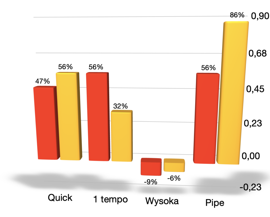 Ciekawą sytuację widzimy w przypadku ataku piłek wysokich, które są najbardziej wymagające. Obie ekipu zanotowały efektywność poniżej zera, czyli więcej straciły swoimi błedami i zablokowanymi atakami, niż zyskały generowanymi punktami. Słabsi w tym elemencie byli gospodarze, zatrzymując się na -9%, a goście -6%. Pierwszy miał 23 ataki tego typu, drugi 31. Ostatni analizowany typ ataku to pipe, czyli ten z szóstej strefy. Zwycięzcy tego meczu zaatakowali dziewięć pipe’ów, osiągając efektywność na poziomie 56 procent, a przegrani siedem razy z efektywnością aż 86 procent. Zdobyli zatem 6/7 punktów.