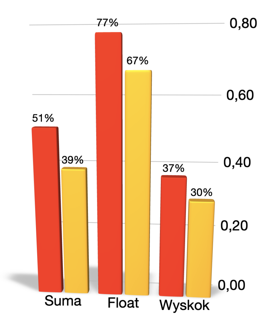 Elementem, który tworzy grę w fazie side-out, jest przyjęcie. Spójrzmy zatem na poniższe słupki. Odzwierciedlają efektywność przyjęcia obu drużyn, która stanowi różnicę pomiędzy procentem pozytywnych zagrań i negatywnych. Suma wszystkich przyjęć okazała się lepsza w drużynie rzeszowskiej (51%). Gdańszczanie osiągnęli w tym elemencie tylko 39%. Przyjęcie zagrywki typu float, to 77% efektywności gospodarzy, a rywale o 10 punktów procentowych mniej. Procenty spadają w przypadku przyjęcia zagrywki z wyskoku, co jest zupełnie naturalne. Znowu mamy przewagę gospodarzy: 37 do 30 procent.