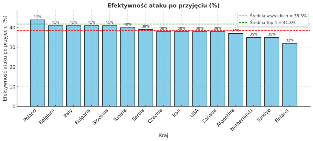 Efektywność ataku po przyjęciu nieco różni się od poprzednich danych. Znowu Polska była najlepszym zespołem z wynikiem 44% i o 3 punkty procentowe wyprzedziła kolejne trzy zespoły – Belgów, Włochów i Bułgarów. Skąd się tutaj wzięli Belgowie? Otóż ich atakujący – Reggers miał niesamowite 44% efektywności ataku. Średnia dla wszystkich analizowanych zespołów wyniosła 38,5% i co ciekawe – Czesi, którzy znaleźli się tuż poza podium – w tym elemencie byli tuż poniżej średniej efektywności. Najistotniejszym wnioskiem dla mnie jest to, że 41% efektywności ataku po przyjęciu wcale nie dawało pewności do stanięcia na podium Mistrzostw Świata.