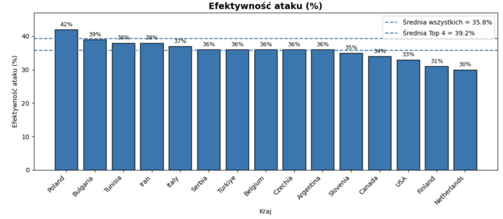 Średnia efektywność najlepszej piętnastki to 36%, ale najlepsze cztery zespoły zatrzymały się w okolicy 39%. To jest naprawdę bardzo wysoka wartość! Jak zawsze, tak też przy tych analizach musimy pamiętać, kto był przeciwnikiem. Na przykład Irańczycy zagrali 5 meczów. Ich rywale to Egipt, Tunezja, Filipiny, Serbia i Czesi. Piąty zespół – Włosi – grał przeciwko Algierii, Belgii, Ukrainie, Argentynie, jeszcze raz Belgii, Polsce i Bułgarii. Myślę, że średni poziom trudności był wyższy dla Włochów. Z tego mogą wynikać duże różnice.