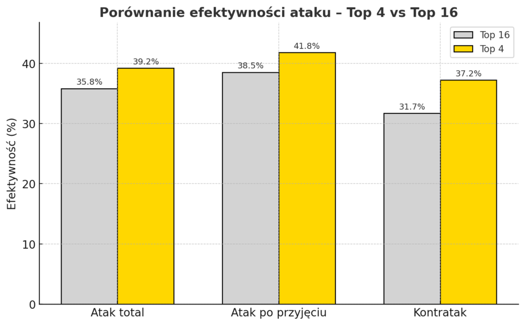Dla najlepszych czterech zespołów (w danym elemencie, a nie w końcowym rankingu) wartości były wyższe o kolejno 3,3 pp w przyjęciu i 5,5 pp w ataku. Zatem najlepsze zespoły zdobywają minimum 3 punkty atakiem więcej na każde 100 ataków.