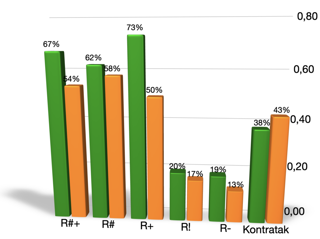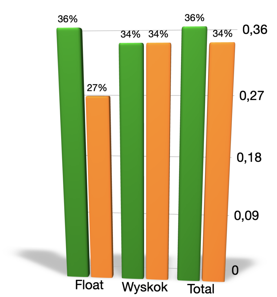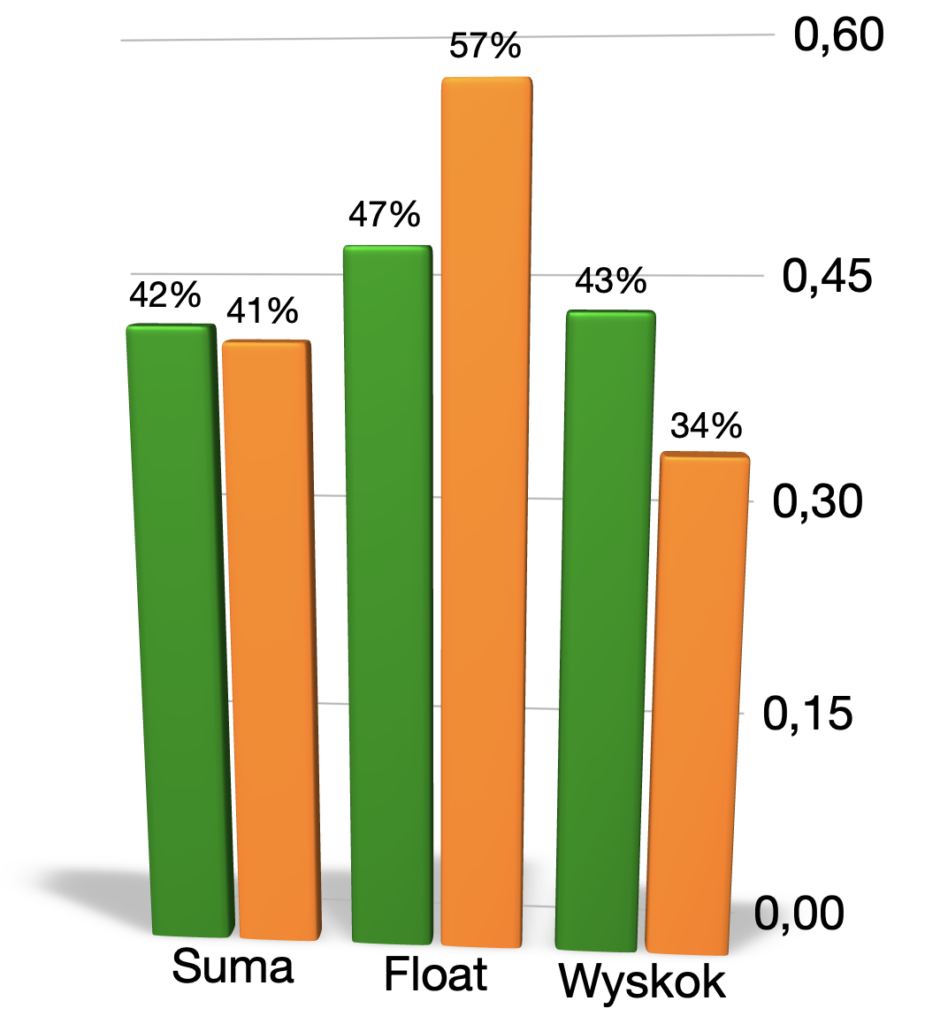 Ciekawe informacje możemy dostrzec także na poniższym wykresie, który obrazuje efektywność przyjęcia. Ogólnie rzecz biorąc, olsztynianie o procent byli lepsi (42 do 41). Jednak patrząc głębiej, dostrzeżemy, że to goście lepiej przyjmowali floata (stosunkiem 57 do 47 procent). Inaczej prezentuje się przyjęcie zagrywki z wyskoku, w której gracze ze stolicy Warmii mieli efektywność na poziomie 43%, a Ślązacy tylko 34%.