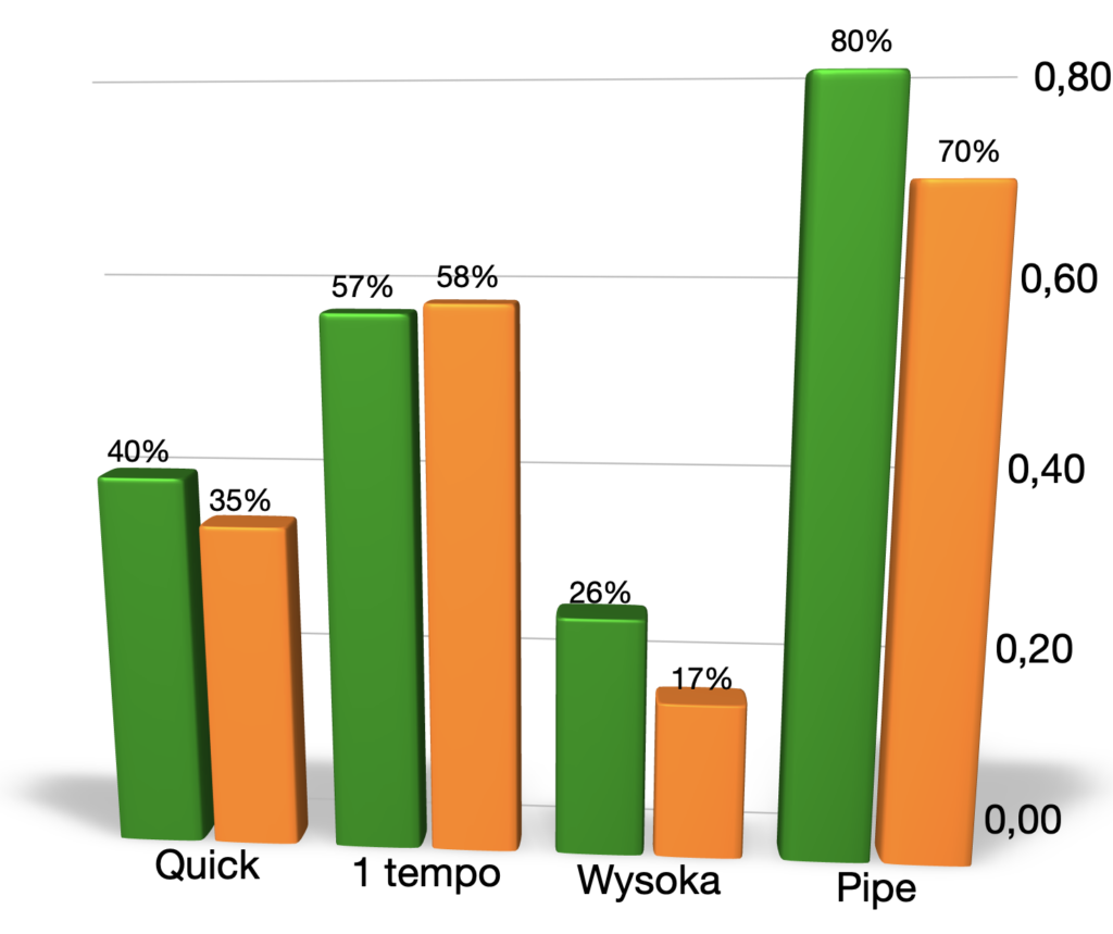 - skuteczność ataku u gospodarzy podskoczyła, a u gości spadła o 4 punkty procentowe,
