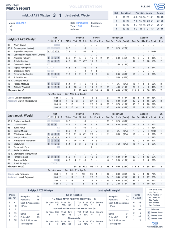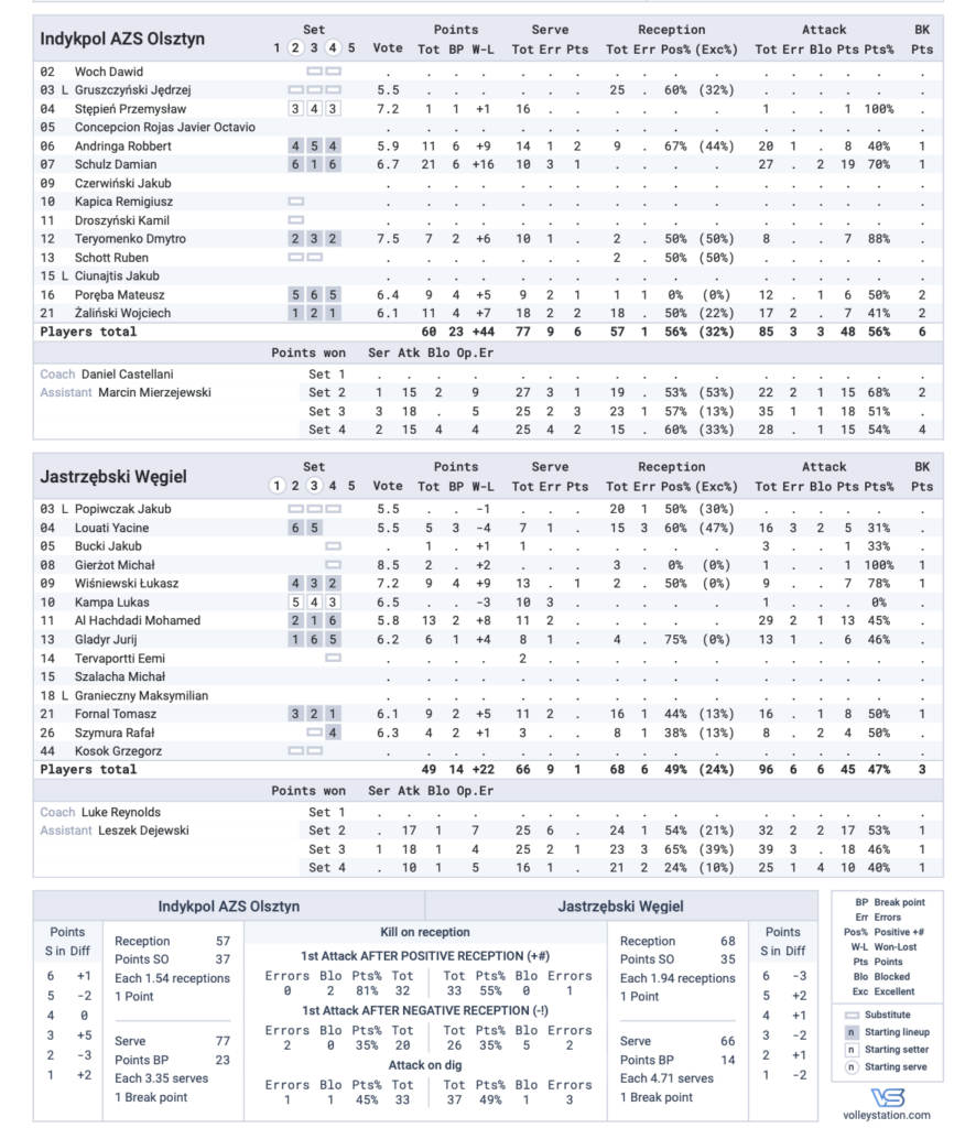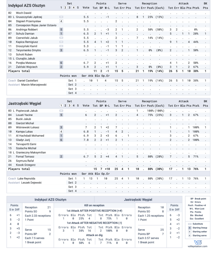 Po stronie gości na wyróżnienie zasługuje Łukasz Wiśniewski, który w ataku miał 80% skuteczności. Zdobył nim 8 punktów, dokładając dwa bloki i jednego asa. Nie popełnił przy tym ani jednego błędu. Jastrzębie jako drużyna przyjmowało lepiej niż gospodarze. Mieli 53% pozytywnego przyjęcia i było to lepiej o 7 punktów procentowych od gospodarzy. Statystyki zostały tu mocno zaburzone przez pierwszego seta, o czym na końcu niniejszego wpisu.