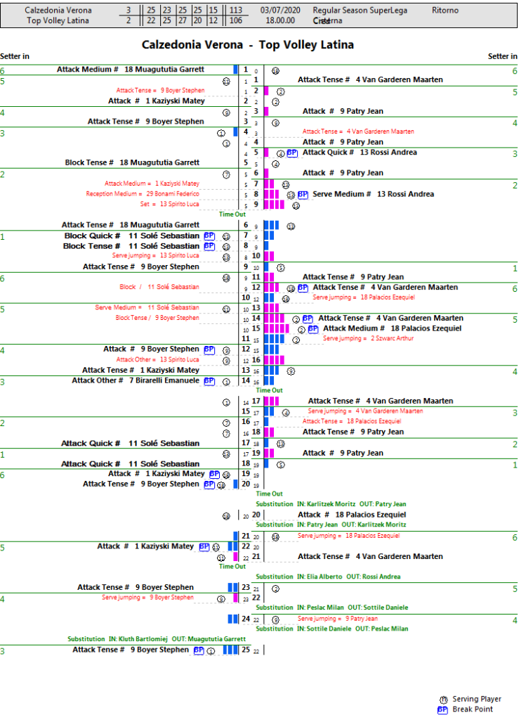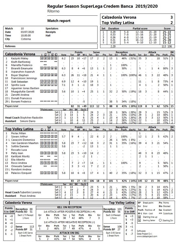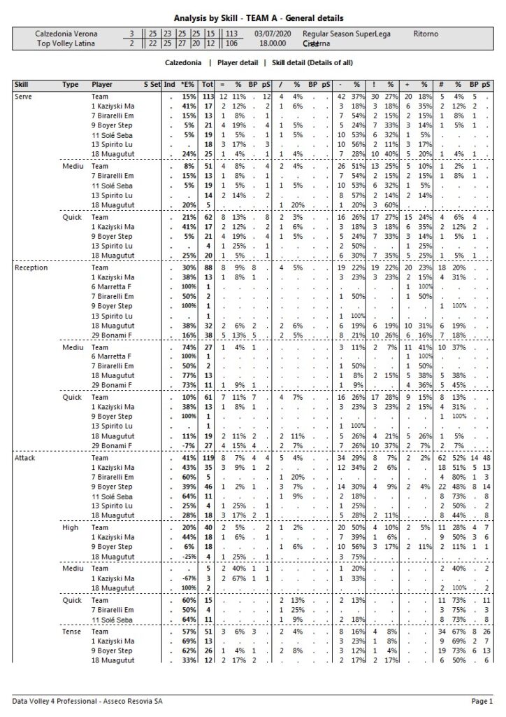 W raporcie meczowym znajdziemy ogólne liczby obu drużyn. Dotyczy skuteczności zagrywki, przyjęcia, ataku każdego gracza. Są tam także tak podstawowe informacje jak: początkowe ustawienia w każdym secie, ratio punktowe, bilanse oraz skuteczność po poszczególnych rodzajach przyjęcia (pozytywnym i negatywnym), a także w kontrataku. Według mnie, największym minusem raportów meczowych jest brak efektywności.