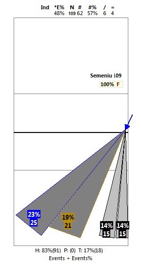 Powyższa grafika pokazuje kierunki ataków w tzw. “conach” lub inaczej “cones”, czyli z użyciem trójkątów. Jak widać, Kamil Semeniuk atakuje 14% ataków po prostej (czyli dokładnie 15 ataków ze 109). Najczęściej wybieranym przez niego kierunkiem jest przekątna (23%) oraz środek boiska (19%).