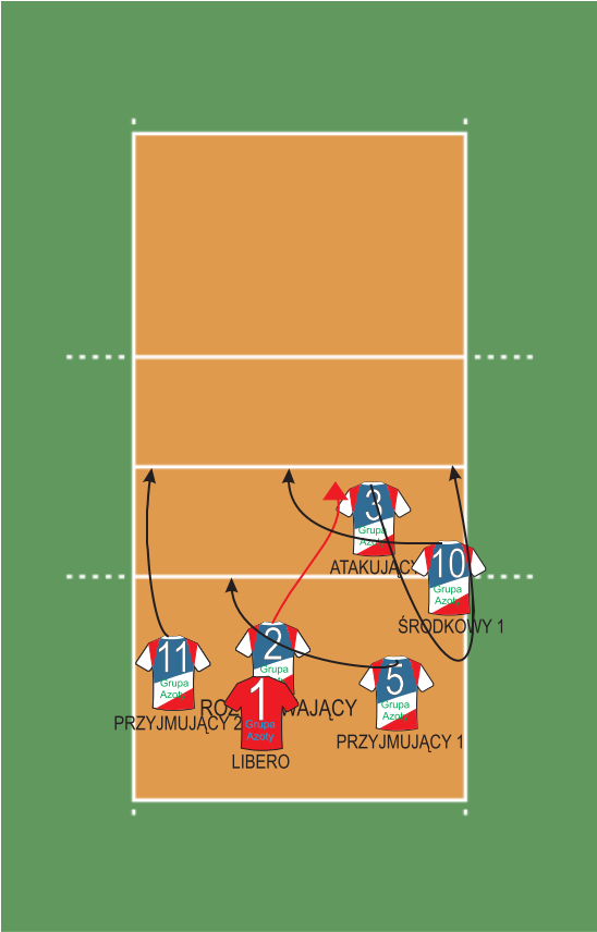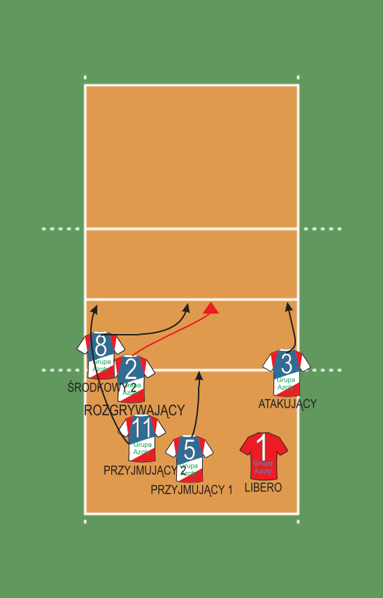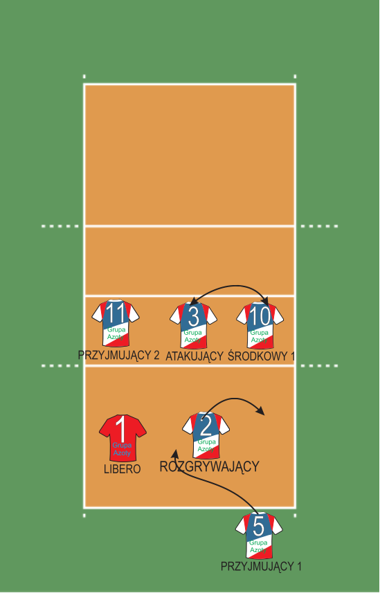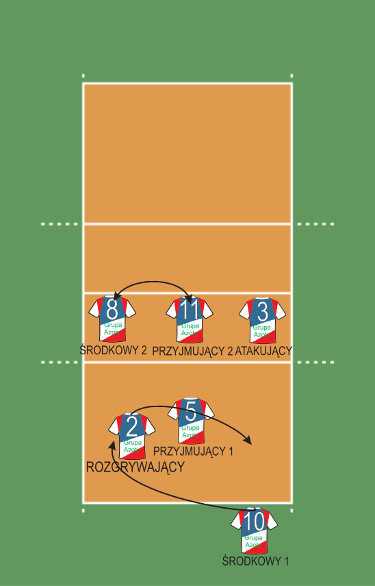 W linii ataku, czyli pod siatką znajdują się: Atakujący (nr 3), Przyjmujący 2 (nr 11) oraz Środkowy 1 (nr 10). Na linii obrony: Rozgrywający (nr 2), Przyjmujący 1 (nr 5) oraz Libero (nr 1) za Środkowego 2. W momencie wykonywania zagrywki Rozgrywający wbiega z 6 strefy pod siatkę (na miejsce czerwonego trójkąta, zgodnie z czerwoną linią). Atakujący odchodzi od siatki, żeby mieć wystarczający nabieg do ataku. Środkowy biegnie do ataku ze środka boiska. Po przyjęciu zagrywki Przyjmujący 2 zmierza do ataku z lewej strony boiska (strefa 4), a Przyjmujący 1 robi nabieg do ataku z drugiej linii (tzw. pipe). Libero w tym czasie przemieszcza się w kierunku zawodnika, który będzie atakował, aby asekurować atak, gdyby piłka wróciła na naszą stronę po dotknięciu bloku.
