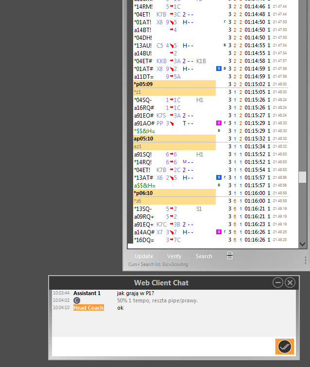 Jednym z podstawowych narzędzi do komunikacji między statystykiem siedzącym za końcową linią boiska, a ławką trenerską jest czat. Jest to narzędzie wbudowane w programy do pisania statystyk. Dzięki niemu, dość szybko można przekazać niezbędne informacje i odpowiedzieć na pytania. Plusy tego narzędzia, to głównie utrzymanie historii rozmowy. Nawet, gdy ktoś jest zajęty w momencie przekazania komunikatu, to po chwili może odczytać i ewentualnie na niego odpowiedzieć. Nie musi w ten sposób odrywać się od aktualnego zadania, na przykład obserwacji akcji, rozmowy z graczem lub kodowania. Jest to świetne rozwiązanie dla szybko piszących statystyków, ale tylko tych z podzielnością uwagi. Tak jak w poniższym przykładzie, statystycy przed odpowiedzią na pytanie muszą wygenerować analizy, na bazie których wydadzą swoją opinię. Niestety czat nie pozwala na przesyłanie plików takich jak grafiki lub gotowe analizy, które jednym kliknięciem odbiorca mógłby zobaczyć ze wszystkimi detalami.