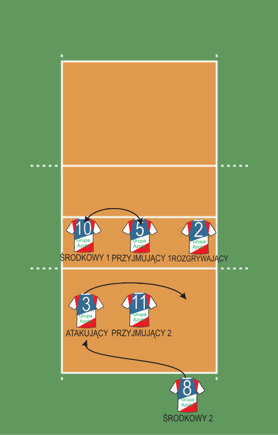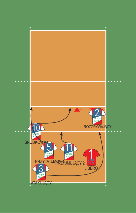 W linii ataku znajdują się Rozgrywający (nr 2), Środkowy 1 (nr 10) oraz Przyjmujący 1 (nr 5). Linii obrony to Atakujący (nr 3), Przyjmujący 2 (nr 11) oraz Libero (nr 1) za Środkowego 2. W momencie wykonywania zagrywki Rozgrywający przemieszcza się z 2 do 3 strefy. Środkowy 1 biegnie z 4 strefy do ataku na środku siatki. Po przyjęciu zagrywki Przyjmujący 1 biegnie do ataku z 4 strefy boiska, Przyjmujący 2 atakuje z drugiej linii, a Atakujący z 1 strefy. Libero robi to…co już mam nadzieję wiecie. 🙂