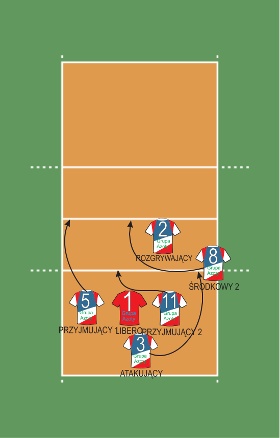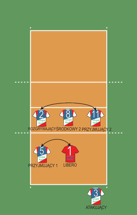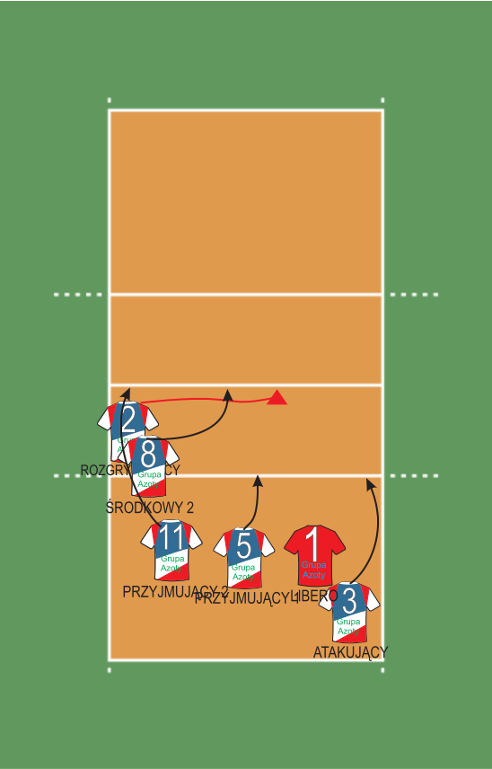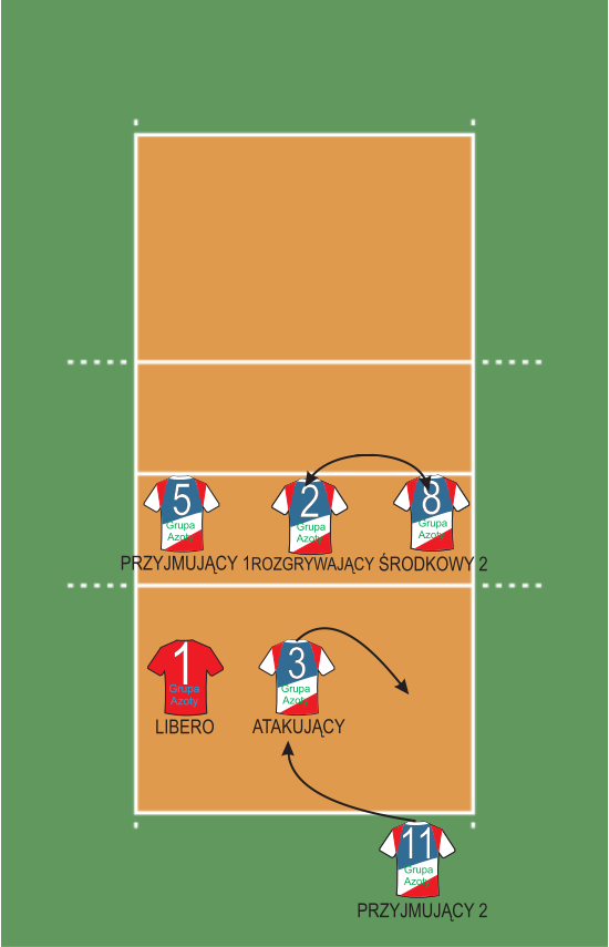 W linii ataku znajdują się Rozgrywający (nr 2), Środkowy 2 (nr 8) oraz Przyjmujący 2 (nr 11). Linia obrony to Atakujący (nr 3), Przyjmujący 1 (nr 5) oraz Libero (nr 1) za Środkowego 1. W momencie wykonywania zagrywki Rozgrywający wbiega na środek siatki (czerwony trójkąt), zgodnie z czerwoną linią. Środkowy 2 biegnie na środek siatki do ataku. Po przyjęciu zagrywki Przyjmujący 2 biegnie do ataku ze strefy 4, Przyjmujący 1 atakuje z drugiej linii, a Atakujący z 1 strefy (prawa strona boiska), pamiętając o tym, że musi odbić się przed linią 3 metra. Libero jak zwykle idzie do asekuracji, a w razie kontrataku przeciwnika zmierza do 5 strefy z zadaniem bronienia piłki.