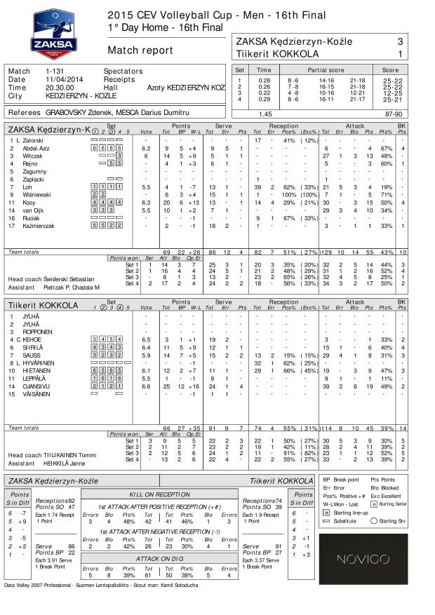PS. Wideo, które tutaj zamieściłem pochodzą z wtorkowego meczu 1/16 Pucharu CEV, który ZAKSA Kędzierzyn-Koźle zagrała przeciwko fińskiej drużynie Tiikerit Kokkola. Dla ciekawych, poniżej zamieszczam raport meczowy z tego spotkania.
