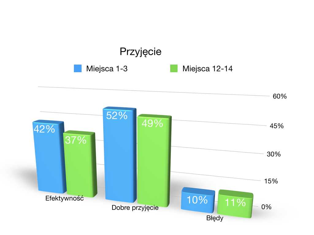 Na powyższym wykresie widoczna jest suma wszystkich rodzajów zagrywek. Efektywnością przyjęcia nazywam różnicę pomiędzy dobrym przyjęciem a błędami. W tym wypadku do błędów zaliczam zarówno bezpośrednie błędy, jak również przyjęcie na drugą stronę. Dlaczego?  Bo jak widać na poprzednim wykresie, takie przyjęcie w ponad 80% stanowi punkt dla drużyny zagrywającej.