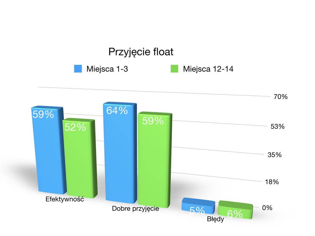 Analizując przyjęcie z wyskoku, widać gołym okiem większą różnicę w błędach popełnionych przez obie grupy zespołów. Mniejsza różnica jest jednak w procentach dobrego przyjęcia. Finalnie różnica efektywności obu zespołów wynosi jednak wciąż około 6%.