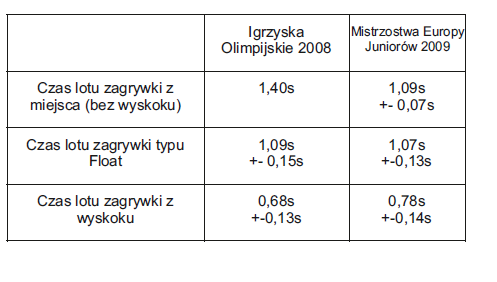 Przypomniało mi się również, że jakiś czas temu w ręce wpadły mi badania dotyczące czasu lotu zagrywki stworzone przez ludzi z Fińskiego Instytutu Sportu oraz Fińską Federację Siatkówki. Porównano czas lotu zagrywki z Igrzysk Olimpijskich w 2008 roku oraz Mistrzostw Europy Juniorów w 2009 roku. Zapraszam do przeanalizowania tabelki: